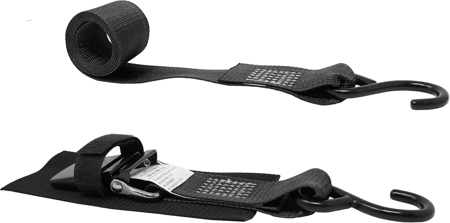 2 Pack, 2 Inch Quick Release Tie-Down, Protective Pad With Hook And Loop Security Strap Sewn Under Buckle, Quick Release Buckle With Black E-coat Finish, Protective Pad Under Buckle, Vinyl Coated S Hook On Each End, Fixed End Strap 0.50 Ft (6 Inches), Adjustable Strap 4 Ft, Total Strap Length 4.5 Ft, Gray Polyester Tie-down Webbing, Made In The USA. Hook And Loop, Commonly Known By The Brand Name Velcro, Sewn In To The Protective Pad To Allow The Buckle And Excess Webbing To Be Additionally Secured While In Use.