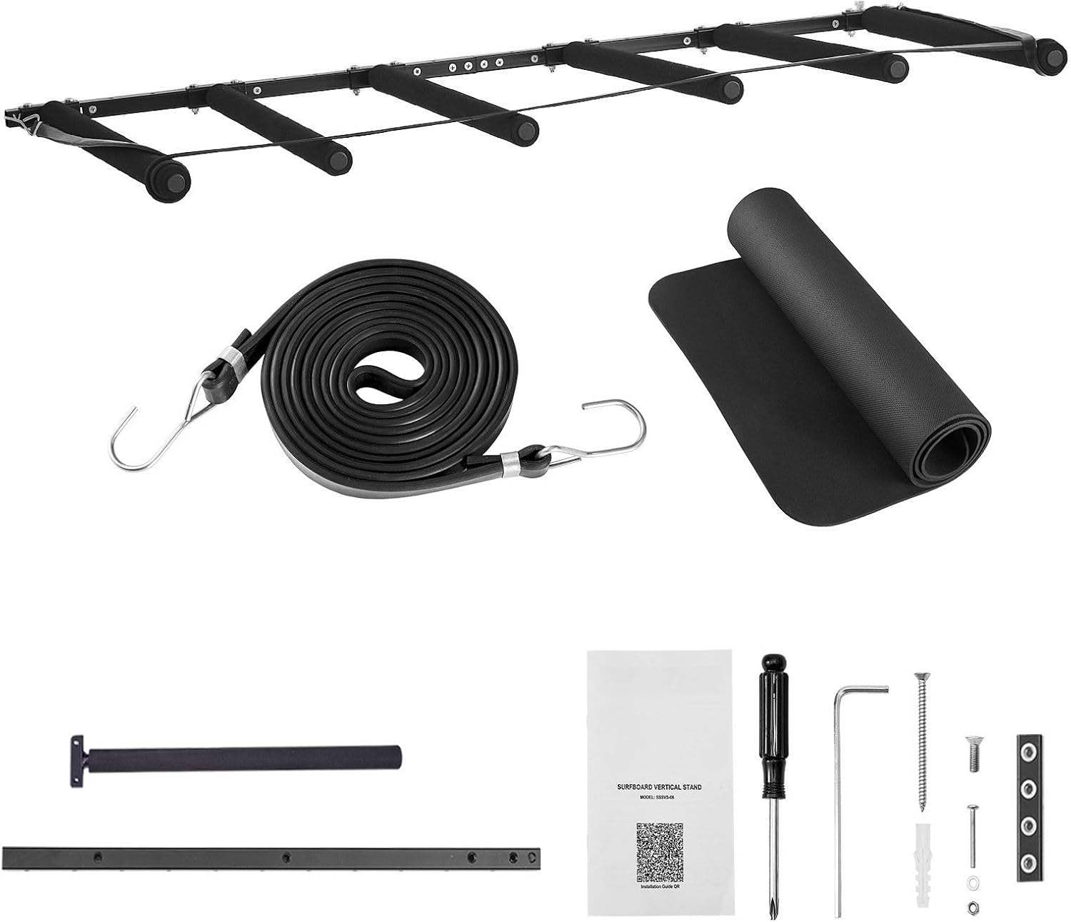 | Included Components | 1 x 2.3m Elastic Rope, 1 x User Manual, 12 x Lock Nuts M5, 12 xStainless SteelScrews M5x38mm, 1x Cross Bar Connector, 1x Open-End Wrench, 1x Phillips Screwdriver, 1xL-Shaped Hex Wrench, 1xSponge Pad, 2 x Cross Bars, 24 x Stainless Steel Washers, 4 x Cross Bar Connector Stainless Steel Screws M5x10mm, 6 x Stainless Steel Self-Tapping Screws M5x60mm, 6x Plastic ExpansionSleeves, 6xBracket Arms |
