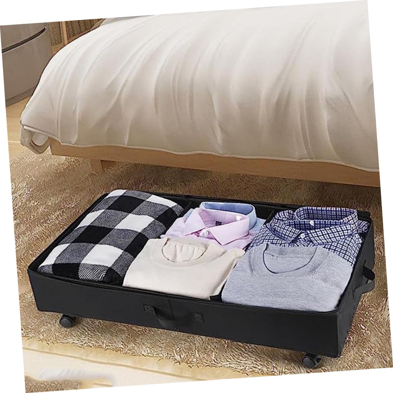 Package List 1 x Under Bed Storage Bag Features -Material:ABS, oxford cloth, iron -Easy mobility: move and retrieve items effortlessly with the sliding wheels underbed storage container. -Color:Black -Size:80.00X42.00X16.00cm/31.44X16.51X6.29in -Product Info:Under-bed storage truck - The zippers on the storage case can open and close easily with fewer efforts, and the transparent window design allows you to see the items in it easily flat storage containers. - The clothes storage bin with wheel is perfect for closet, shelf, under bed, to make full use of these places for storage under-bed storage. - The handles on the storage bag make it easy for you to move the under bed storage bag underbed storage with wheels for comforter. - With a large capacity, the under bed storage bag can be used to store clothes, blankets, bedding, , etc under-bed storage boxes.Goods Descriptioncontainers for organizing under bed Reasonable design and good craftsmanship make it provide you with a .large capacity clothes storage bag A great storage bag for travel, moving house or home storage using.bedding storage containers This under bed storage bag is made of ABS, oxford cloth, iron material for and use