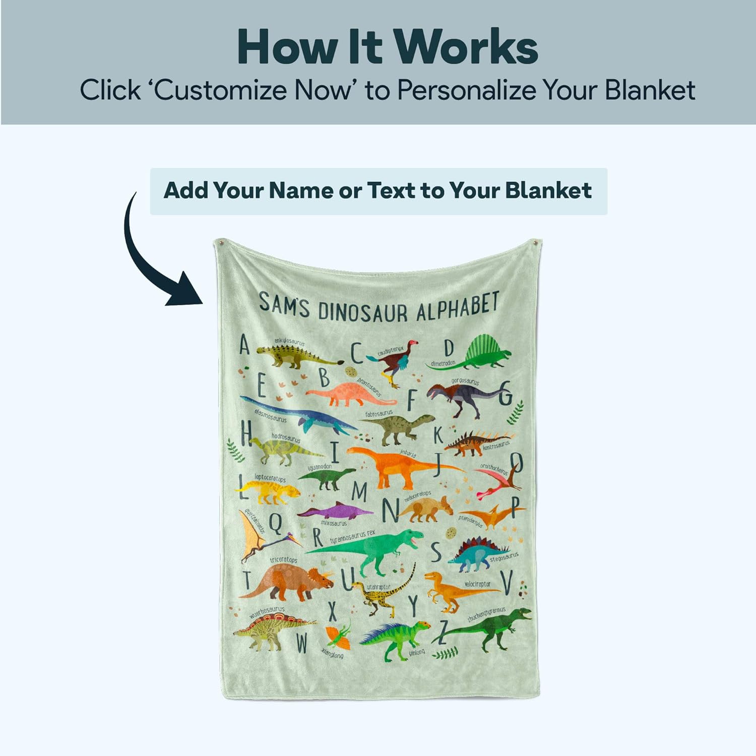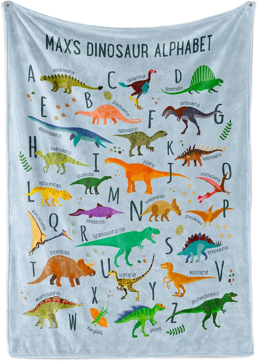Combine your child's love of dinosaurs with early learning! This personalized dinosaur alphabet blanket features colorful dinosaurs alongside the ABCs, custom printed with your child's name. Printed in the USA with vibrant, long-lasting inks on premium fleece or sherpa fabric. An incredible gift for dinosaur-loving kids that makes learning the alphabet exciting and fun.