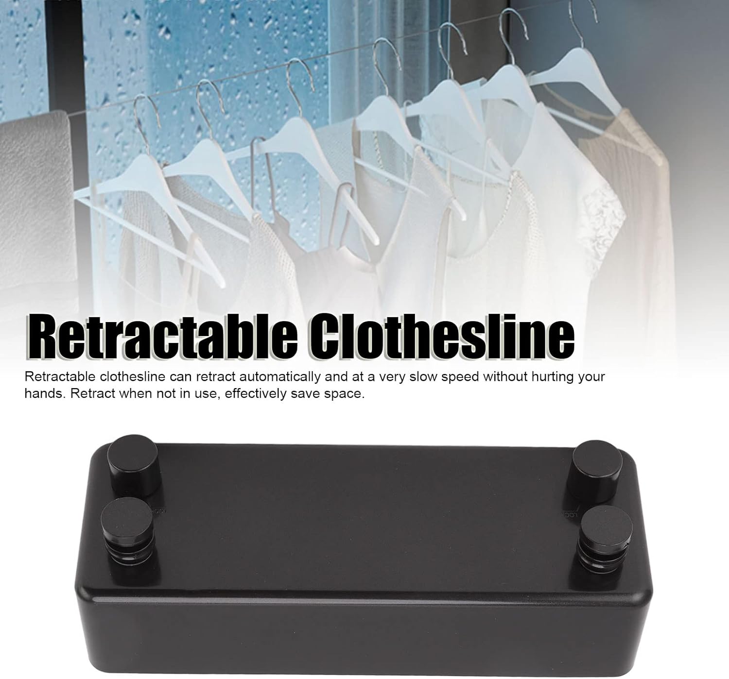 1. [AUTO RETRACTION] Safely retracting at a slow speed without hand injury or space waste. Save space and prevent accidents with ease. 2. [RUST-PROOF DESIGN] Built with thickened stainless steel to resist rust. Ideal for drying various items like towels and cloth diapers. 3. [EASY TO USE] Pull out, lock, and tighten with a simple knob. Prevent sagging and start drying your clothes effortlessly. 4. [VERSATILE APPLICATION] Suitable for indoor and outdoor use, in hotels, balconies, bathrooms, and more. 5. [PREMIUM MATERIALS] Features a heat and impact- ABS shell for longevity and durability. Specification: Item Type: Retractable Clothesline Material: ABS Plastic, Stainless Steel Shell Size: Length: Approx. 24cm / 9.4in, Width: Approx. 8.8cm / 3.5in, Thickness: Approx. 5.7cm / 2.2in Line Length: Approx. 4.2m/13.8ft Gross Weight: Approx. 950g/33.5oz packing list: 1 x Set of Retractable Clothesline (Total 6 Pieces) 14 x Self Tapping Screws 14 x Expansion Tube Note: Manual measurement, please allow some errors.